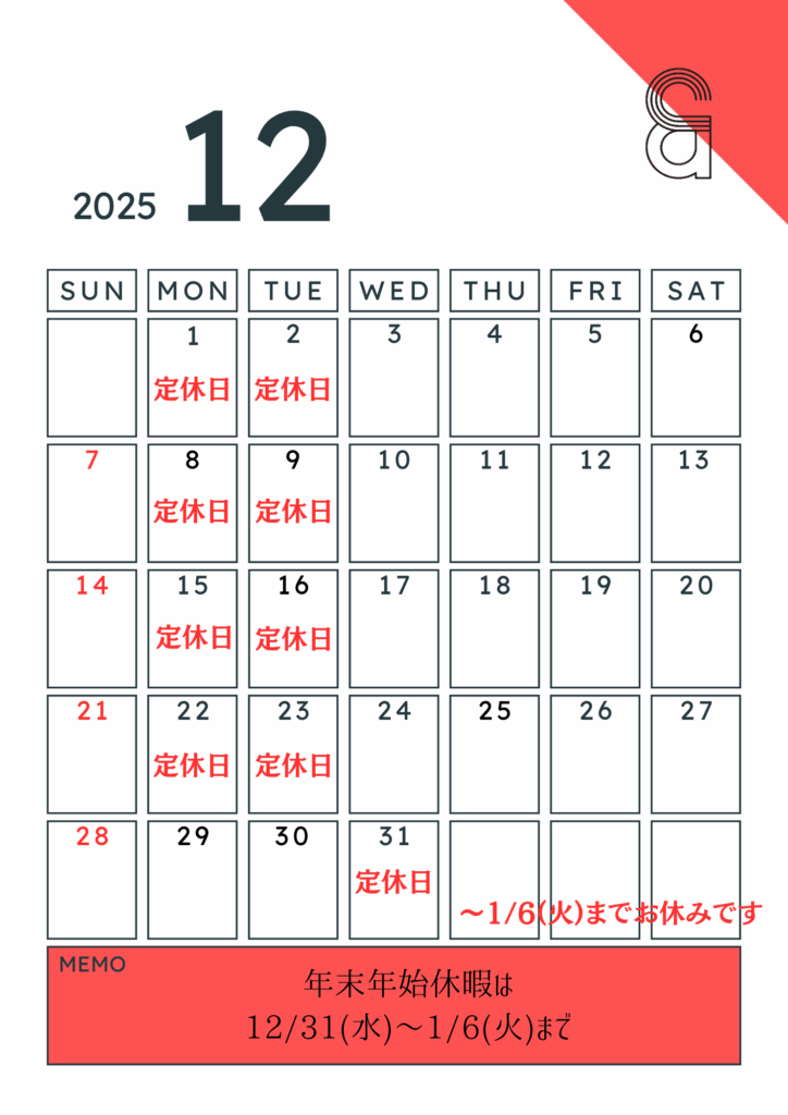 年末年始休暇は12/31(水)〜1/6(火)までとなります。