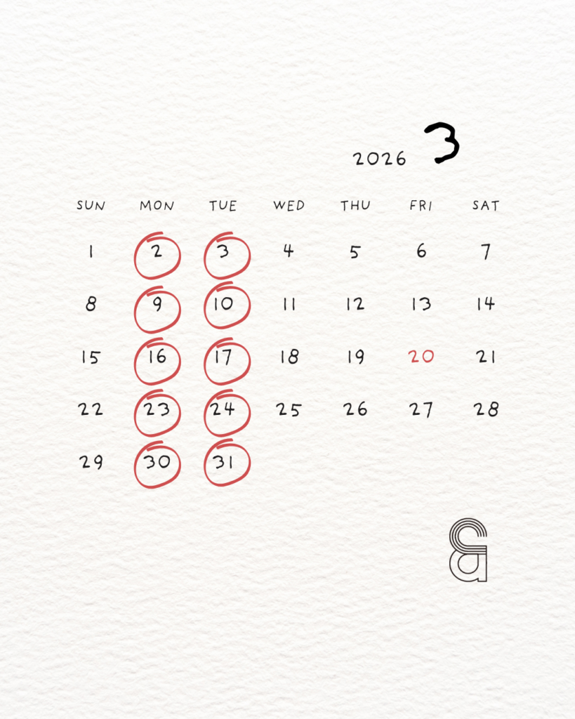 3月のお休みは上記カレンダーをご確認ください。